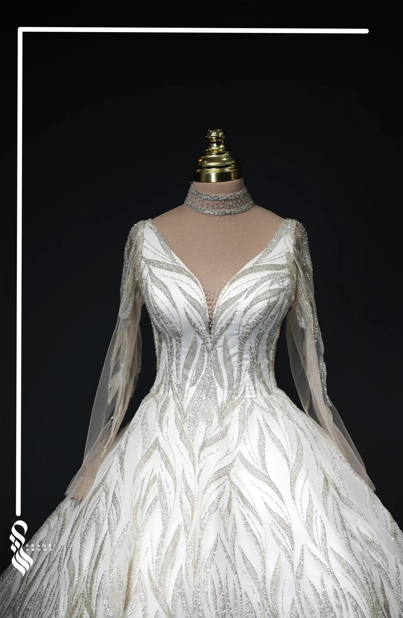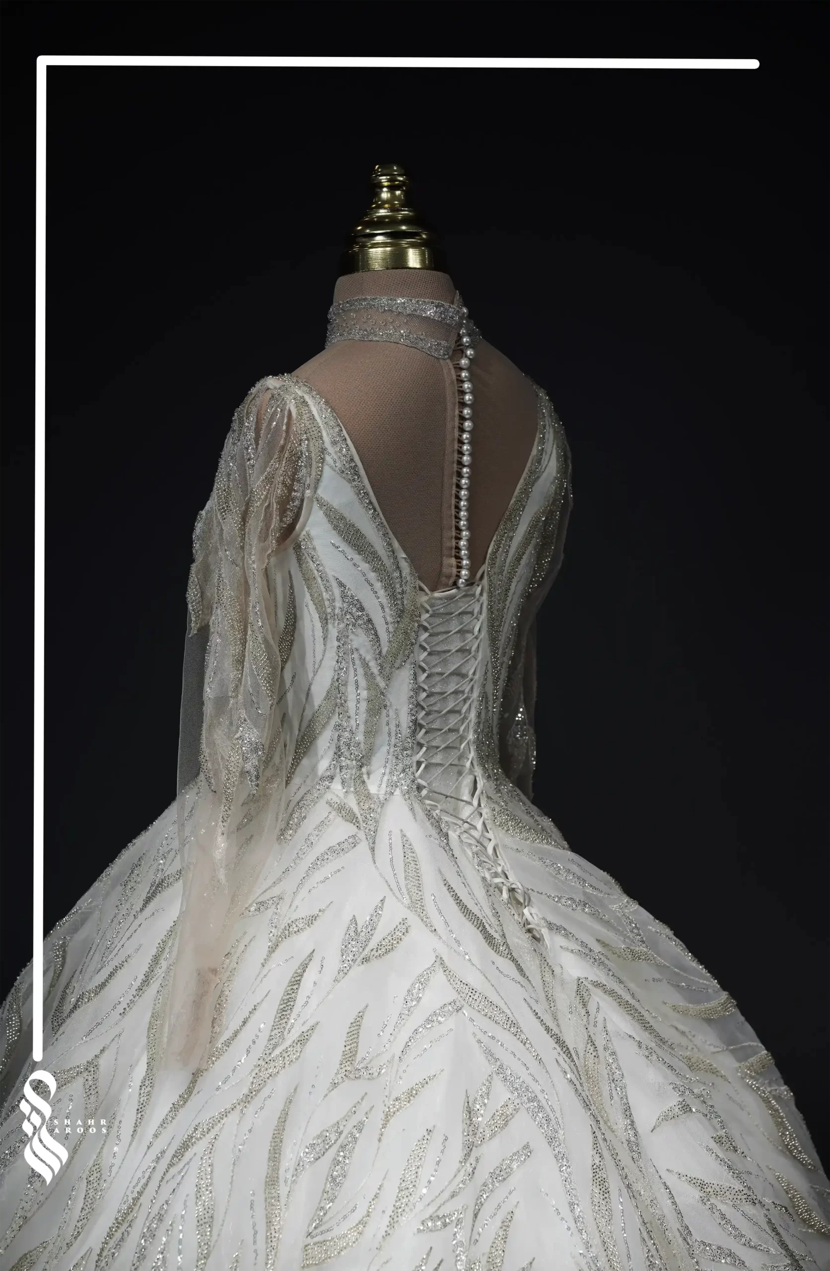 در قسمت آستین از تور رنگ بدن استفاده شده که در هنگام پرو کاملا با رنگ پوست مطابقت دارد و کار دست و دیزاین پر کار آستین که جلوه ای ویژه  به لباس و عروس میدهد.